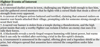 This is a document of two tables. The first contains events that a Fighter would notice and might interact with. The second is a table of Activities that might give the Fighter something that would attract their interest.