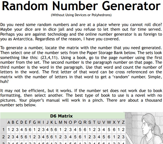 Ever need to generate a random number for a game when you cannot use dice? No? They go away! For the rest of you, take a chance on me. This is not as quick as rolling dice. It isn't meant to be. All you need is this document and a book of about 100 pages. Your manual will work. Any novel will also work. At work? In a quiet place? Dice flew off the car roof in transport? I have you covered.